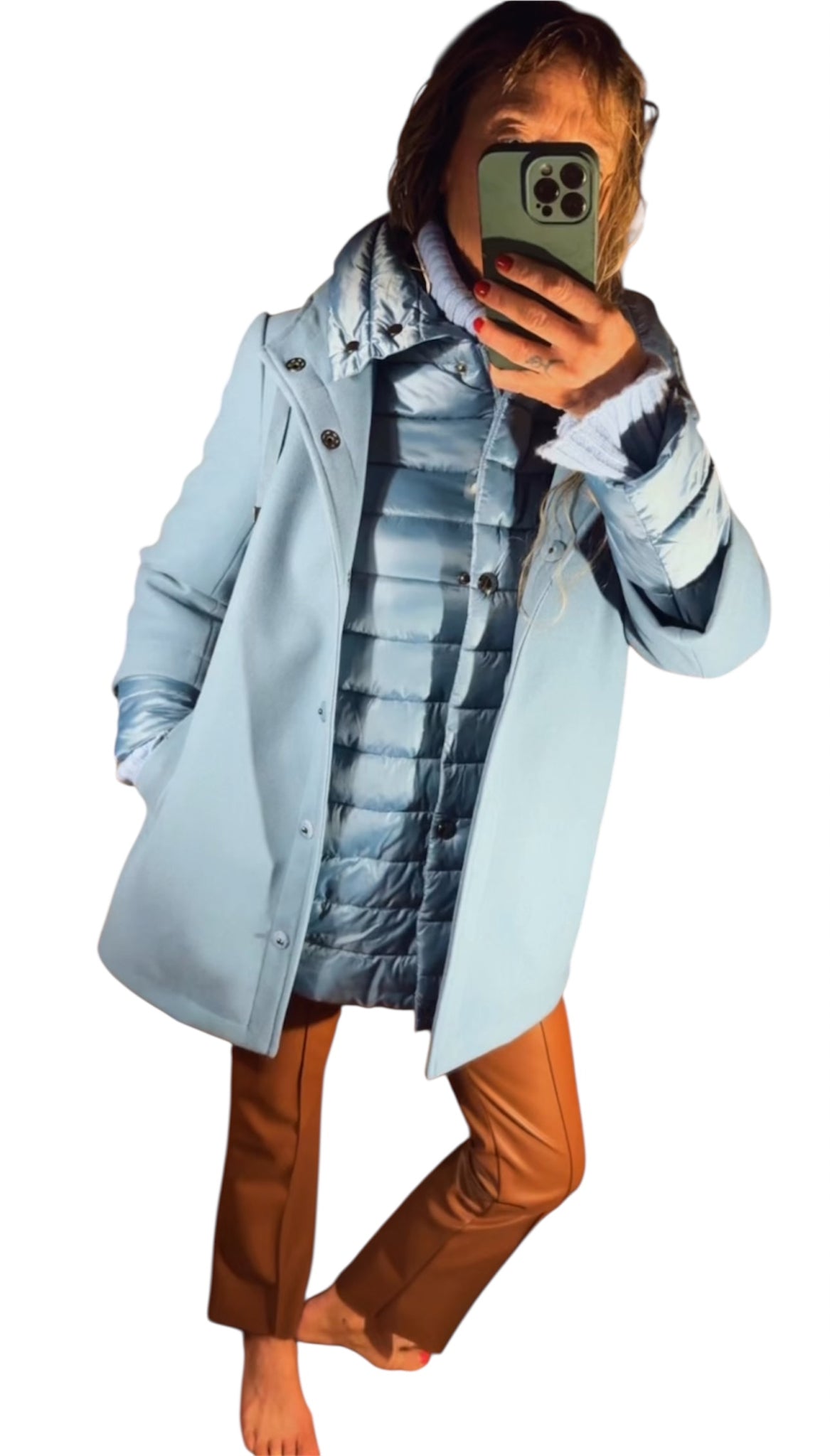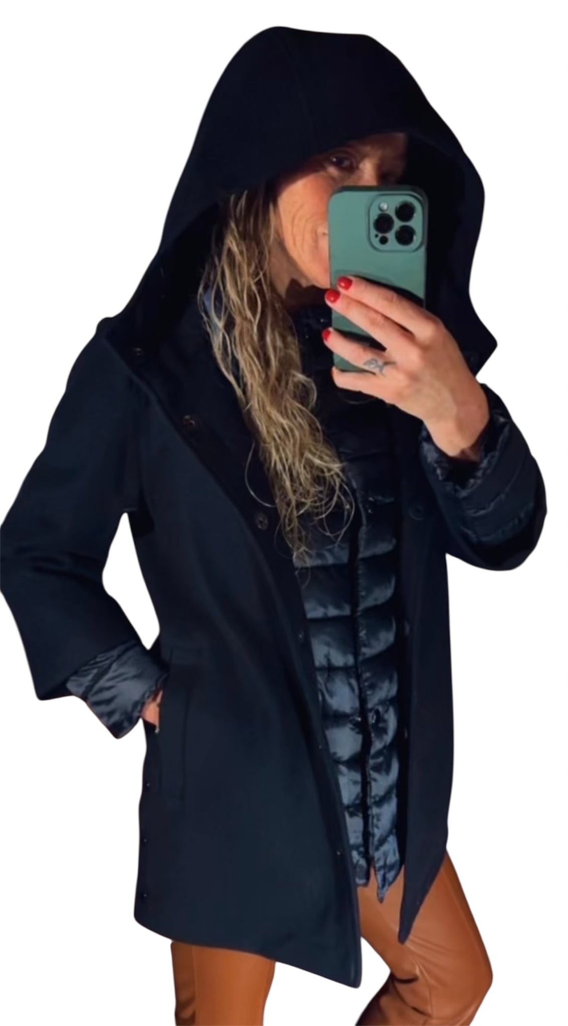 Giaccone composto da due capi, uno in ecopiumino, 100 g e l’altro in tessuto panno con cappuccio Debora indossa la taglia XS