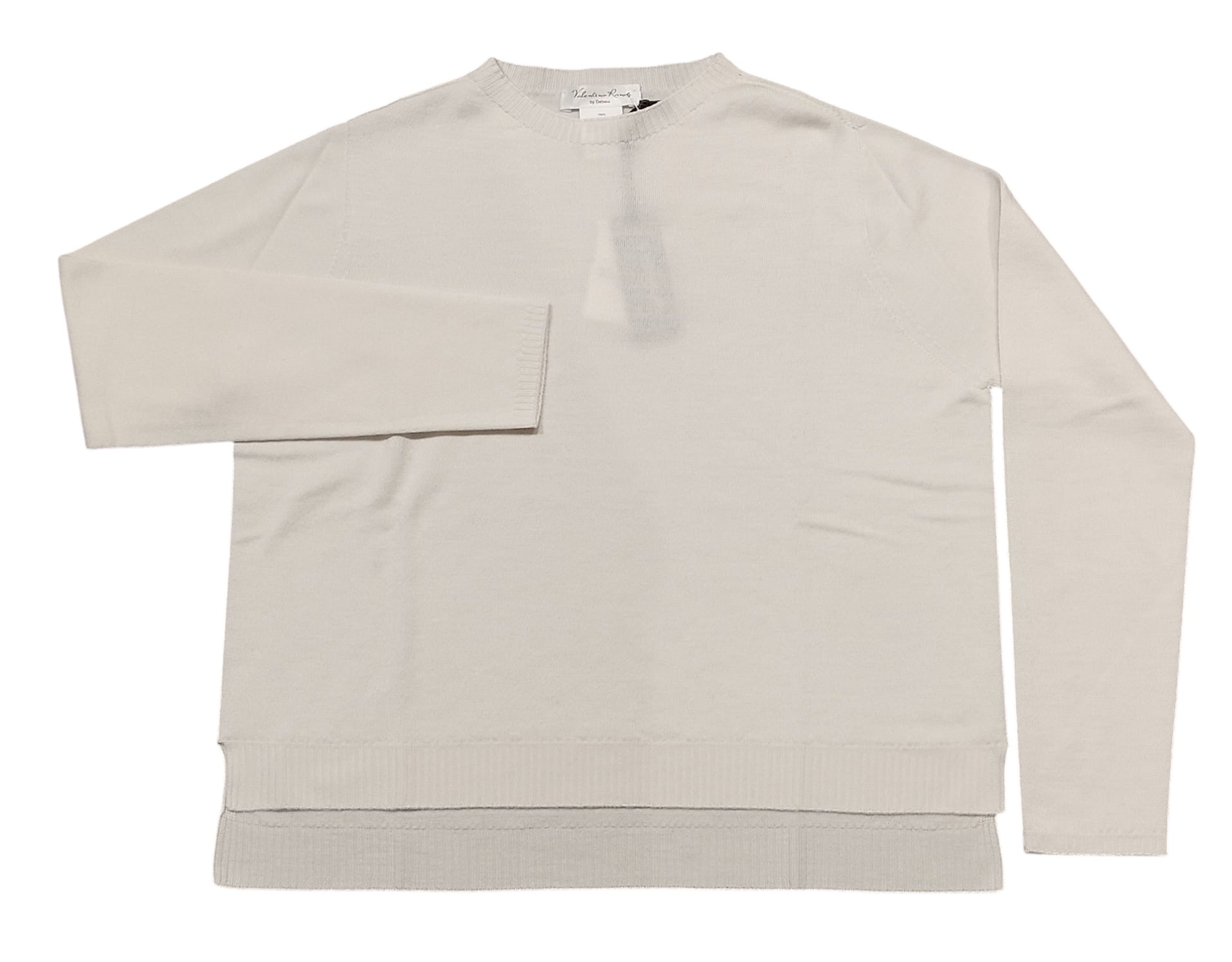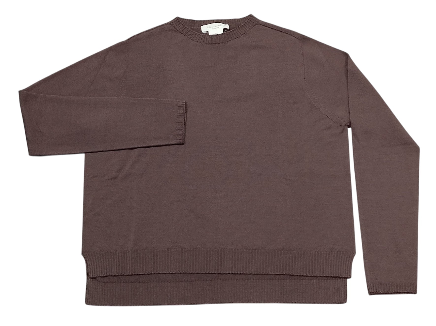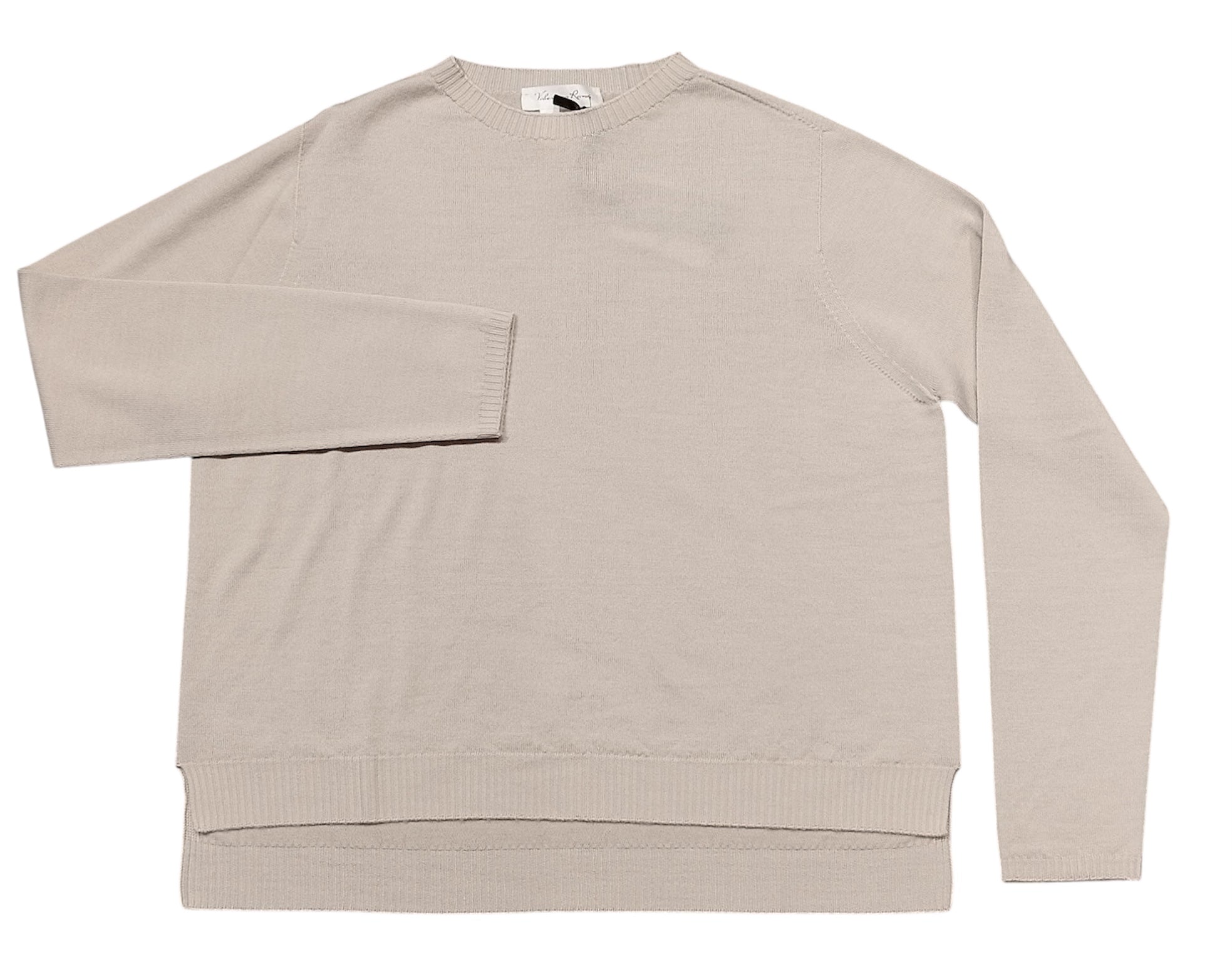 Maglia girocollo manica lunga a scatola più corta davanti e lunga dietro.