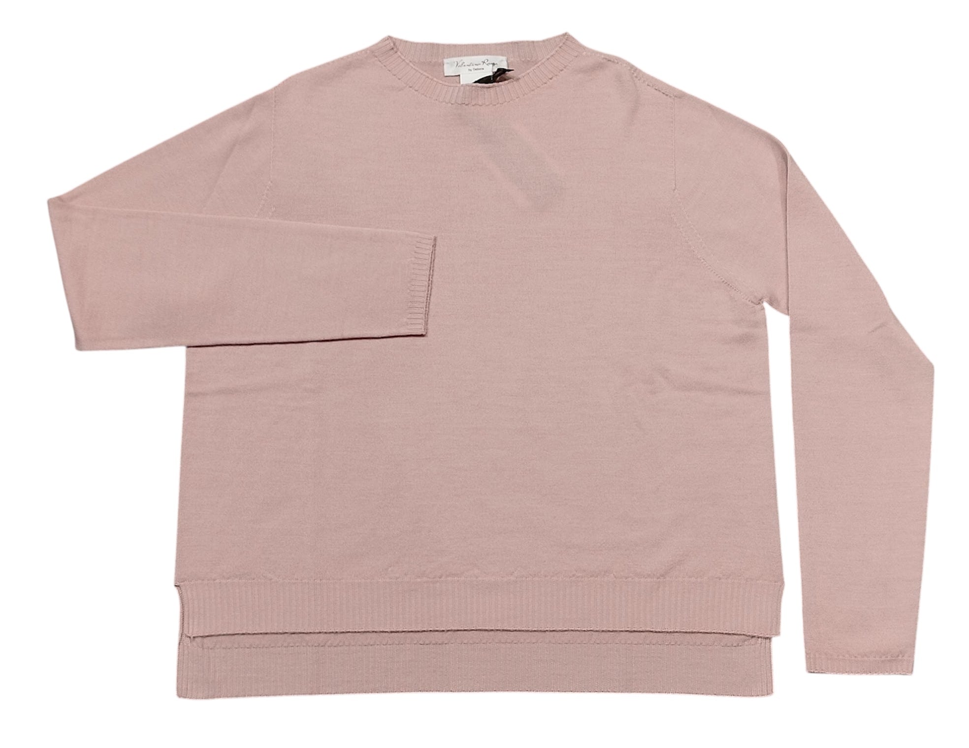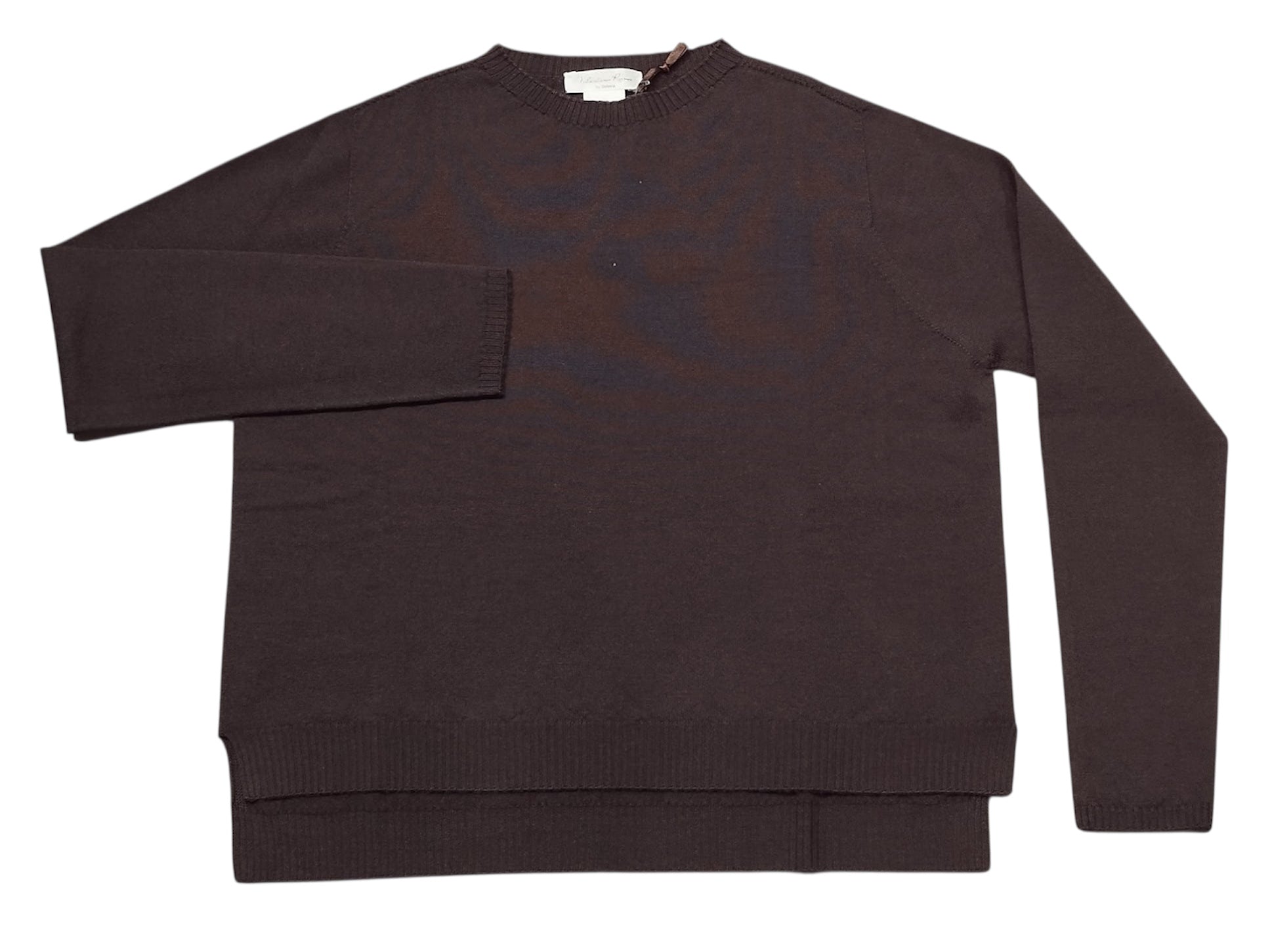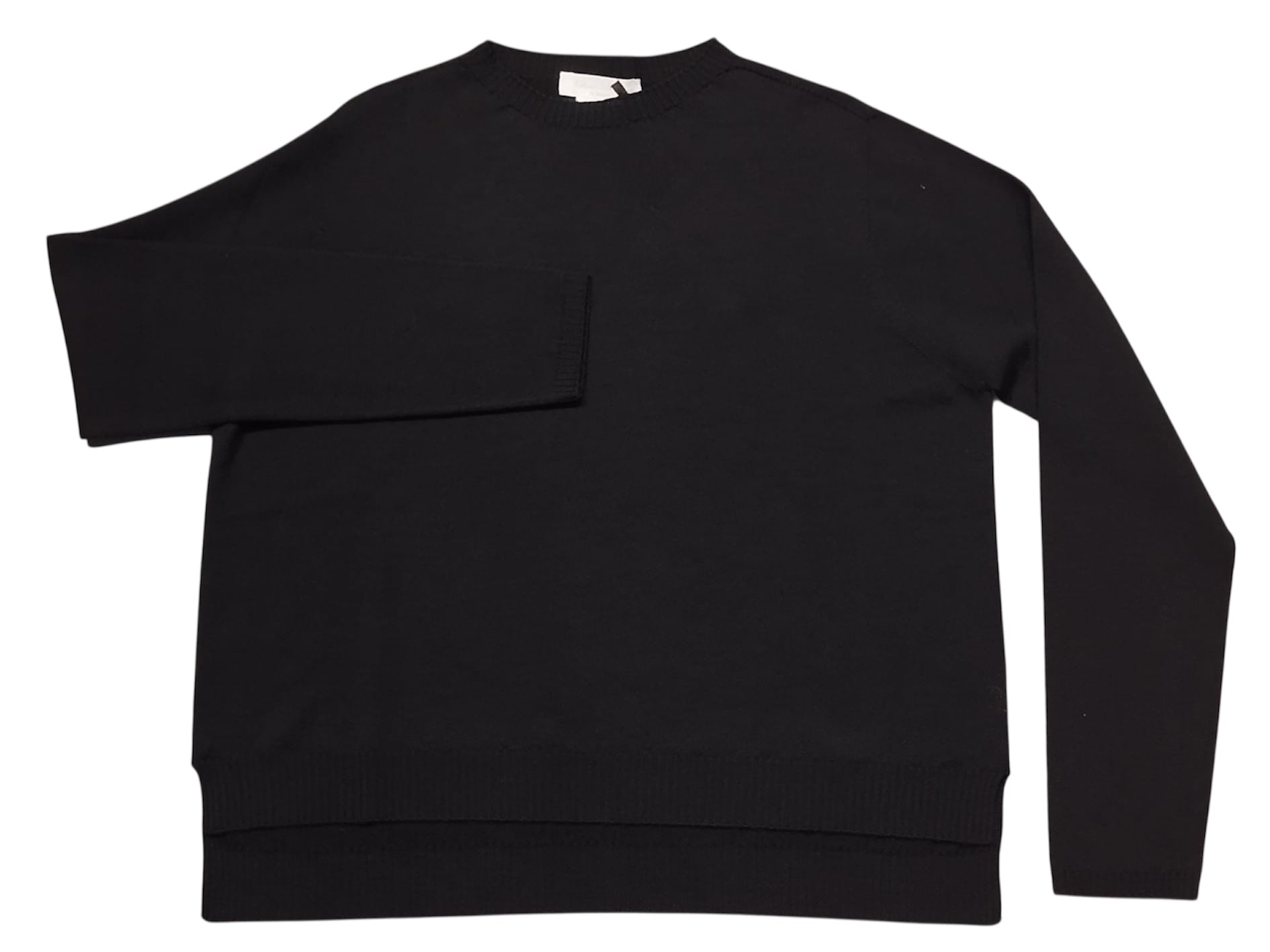 Maglia girocollo manica lunga a scatola più corta davanti e lunga dietro.