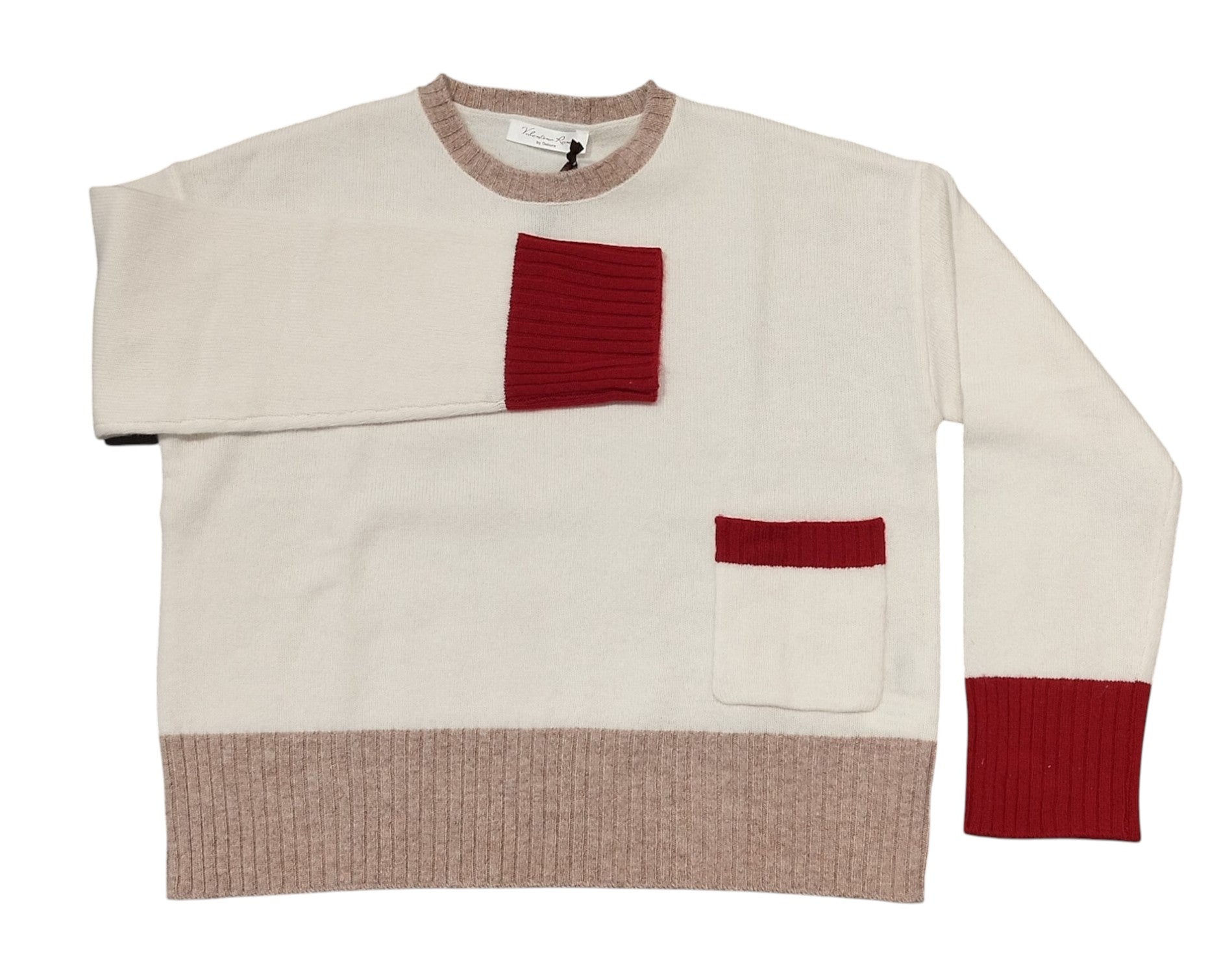 Maglia a girocollo in pura lana a scatoletta, manica lunga, taschina sulla parte davanti con bordi in contrasto