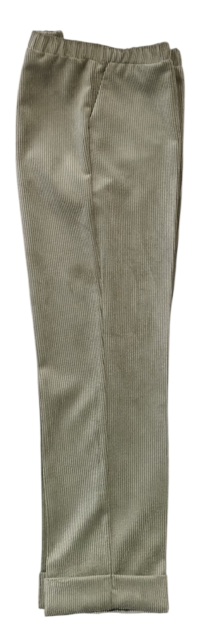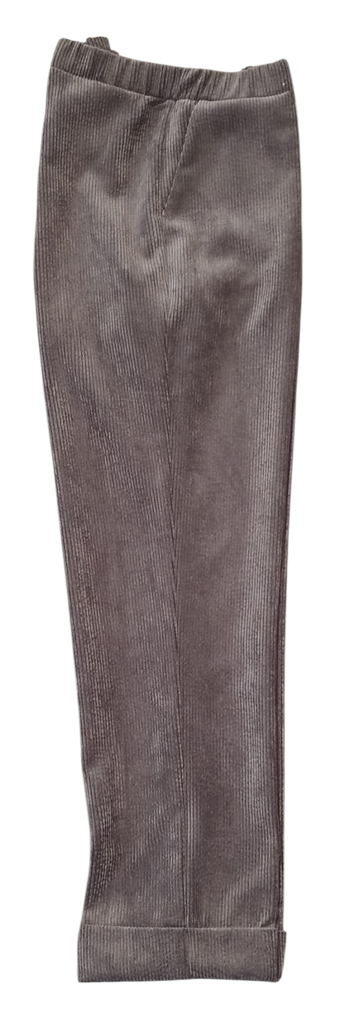 Pantalone con elastico in vita, tasche laterali e gamba stretta ma morbida con risvolto in basso, in velluto a coste.
