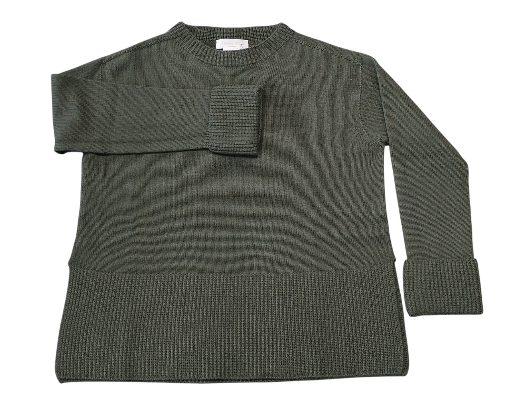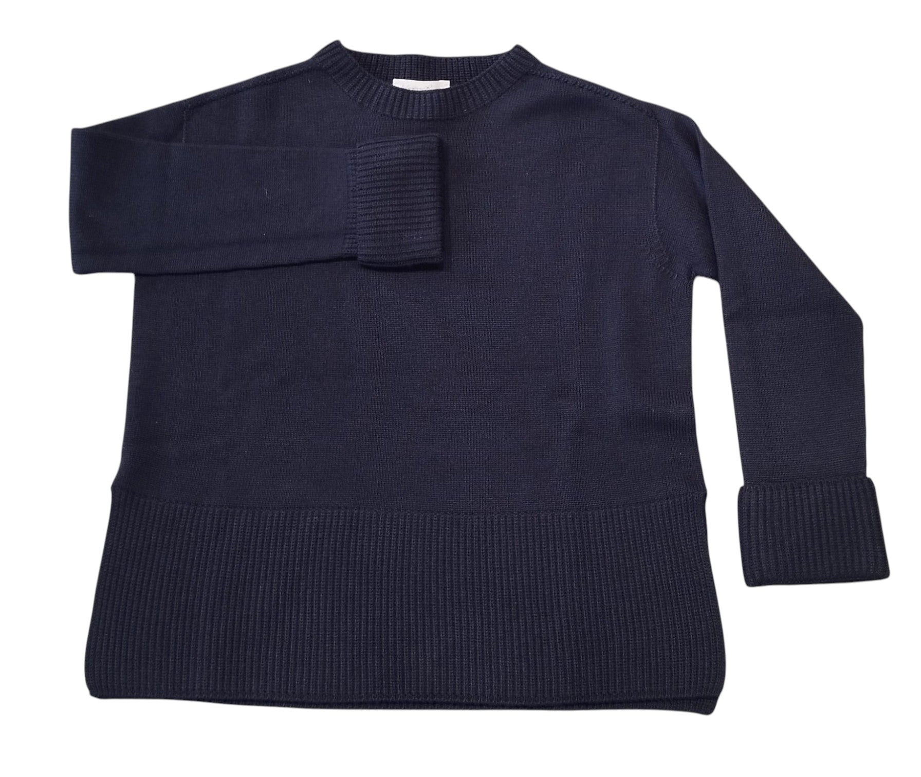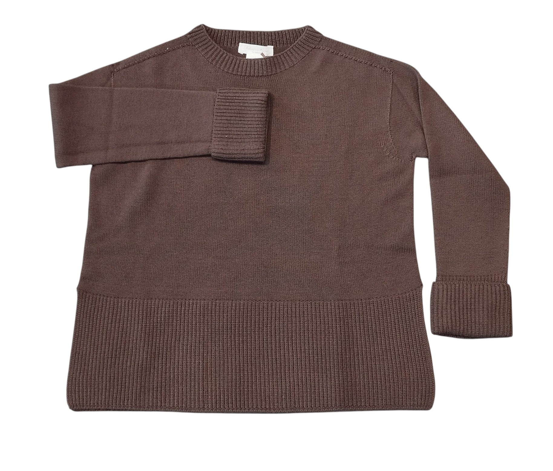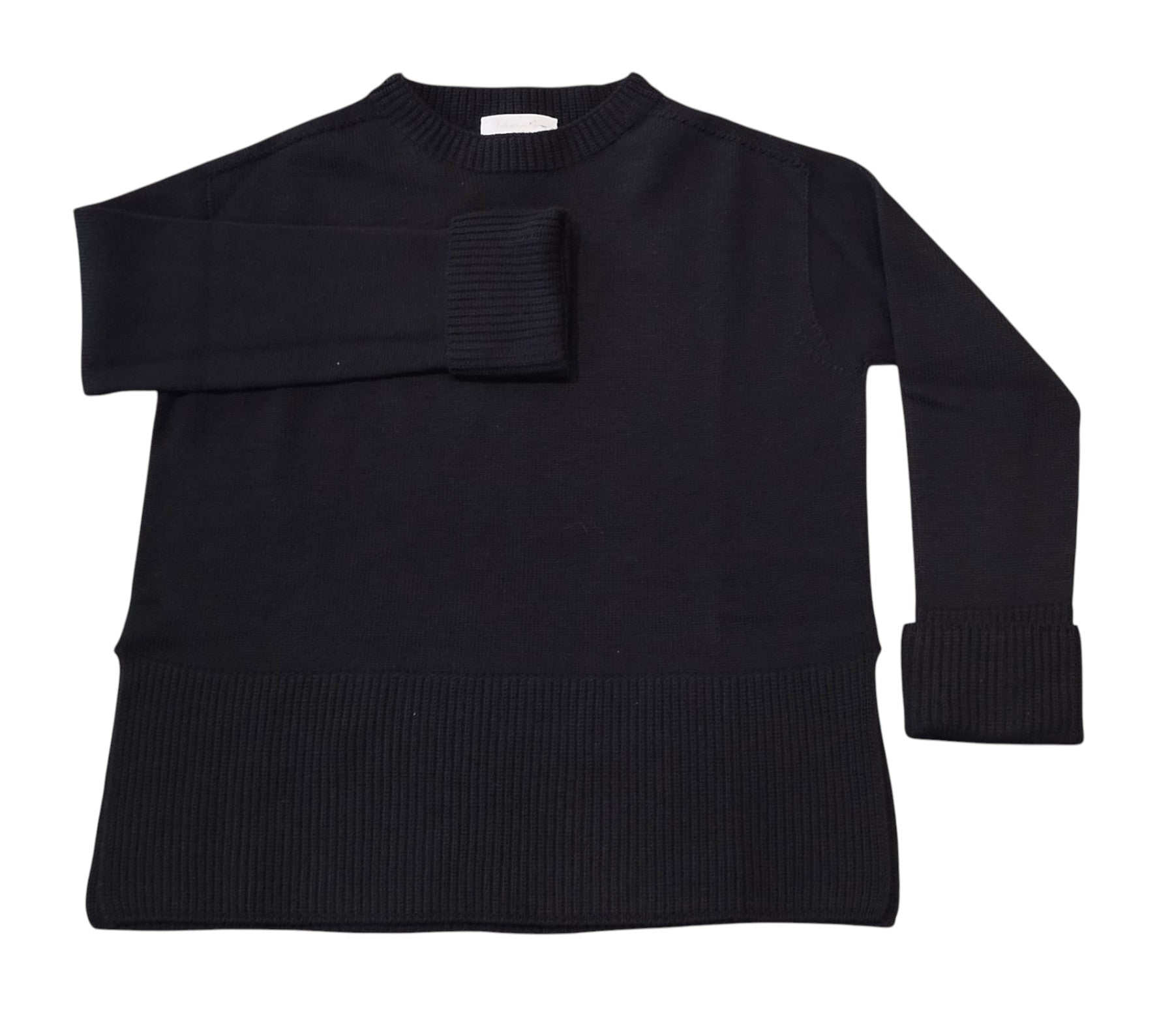 Maglia girocollo manica lunga con risvolto sul polso a costa larga, spacchi laterali sul fondo
